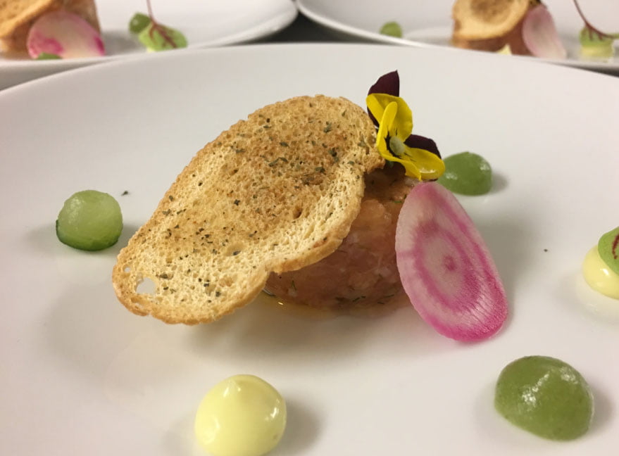 Na het ontvangst met een glas cava zijn de gasten aan tafel uitgenodigd voor het culinaire spektakel. De gerechten werden begeleid door mooie bijpassende wijnen die in samenspraak met de opdrachtgever zijn geselecteerd.